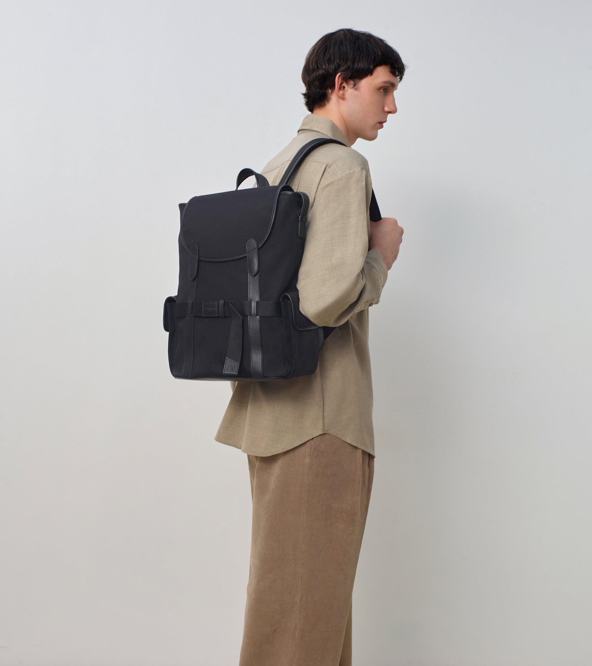 Nylon fabric and smooth full-grain cowhide leather, combining modernity and elegance with enhanced durability.